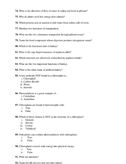 Biology Life processes Imp quessionaire